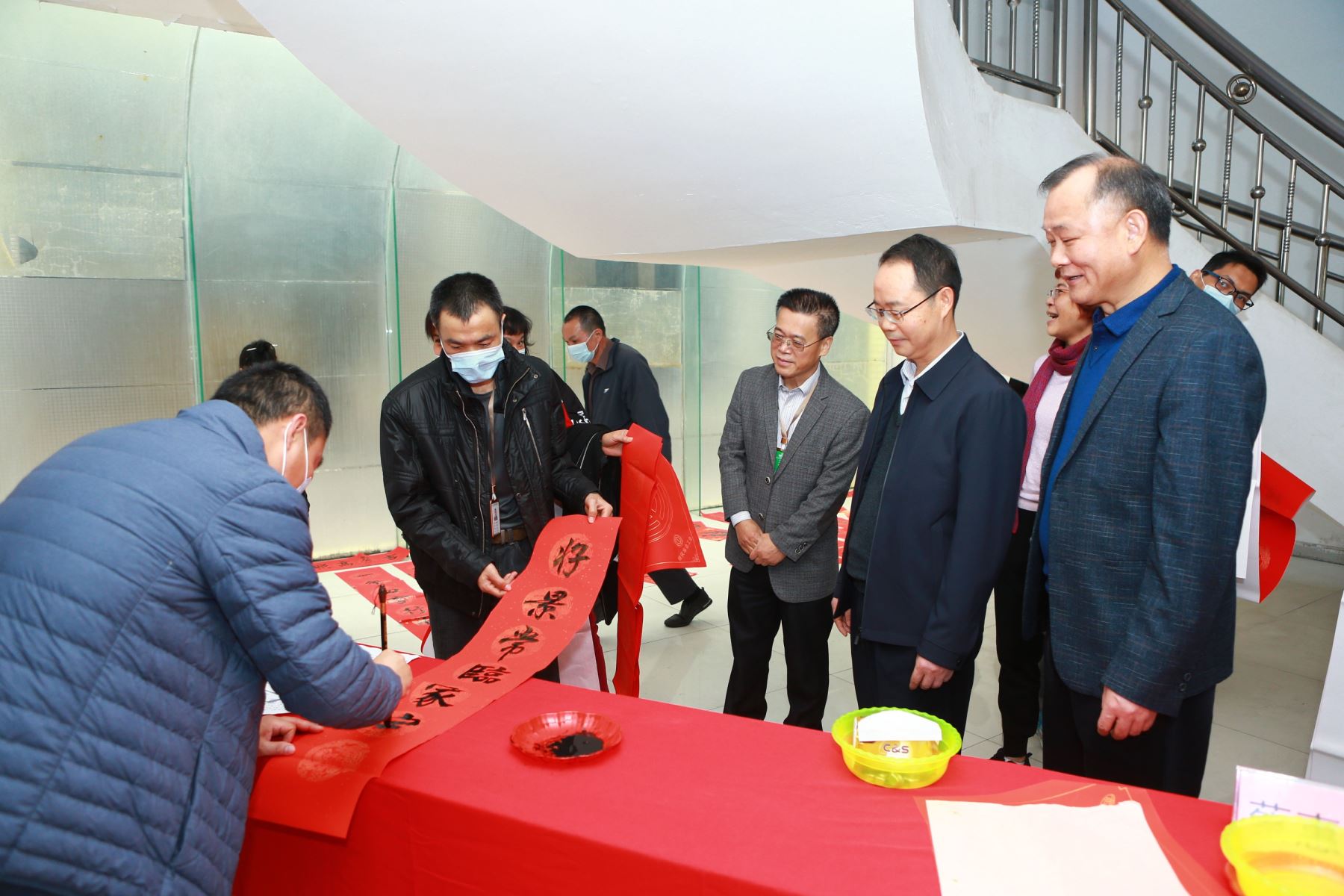 活動當(dāng)天,星湖生物工程基地廠區(qū)綜合樓前張燈結(jié)彩,現(xiàn)場掛滿大紅春聯(lián),筆墨紙硯一列排開,員工們興高采烈地討論著各副春聯(lián)的蘊(yùn)意,挑選好自己喜愛的春聯(lián)內(nèi)容,排起“長龍”興致勃勃地欣賞書法家即席揮毫。集團(tuán)3名書法家和公司的4位書法愛好者帶著濃濃墨香和深深祝福,在活動現(xiàn)場揮毫潑墨、大顯身手,字體或?yàn)t灑飄逸、或方潤整齊,多種風(fēng)格迥異,引得員工贊嘆。特別是集團(tuán)的幾位書法家,連續(xù)揮毫三個多小時,不停歇地為熱情高漲的員工書寫春聯(lián)贈“?!保骸皣┟癜卜晔⑹?風(fēng)調(diào)雨順頌華年”、“金牛拓出豐收景 瑞虎迎來幸福春”……,有祝福祖國昌盛的、有祈求幸福安康的,手寫的春聯(lián)透著墨香,傳遞著暖意,濃濃的年味“撲面而來”,書法家們將近500副的春聯(lián)和“?!弊炙偷絾T工手上。