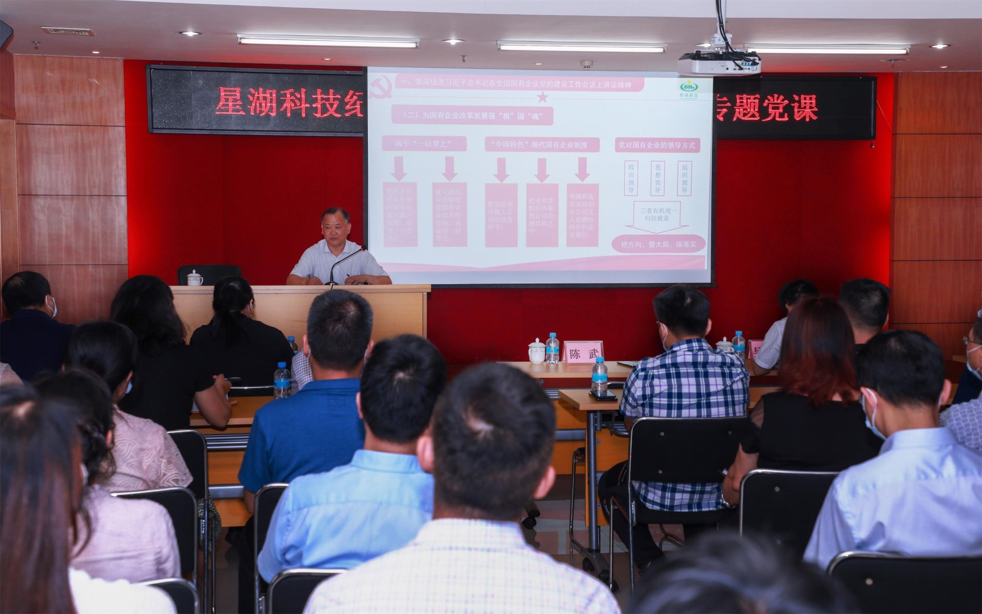 7月1日,為慶祝中國共產(chǎn)黨成立99周年,進一步落實基層黨建三年行動計劃,鞏固拓展“不忘初心、牢記使命”主題教育成果,推動基層黨組織全面加強全面過硬,公司黨委書記陳武以“準確把握新時代國企黨建新要求,推動基層黨組織全面加強全面過硬”為主題為黨員干部上了一堂生動、內(nèi)容豐富的黨課。公司班子成員、總助、車間主任及以上管理人員、黨員代表160余人參加。
